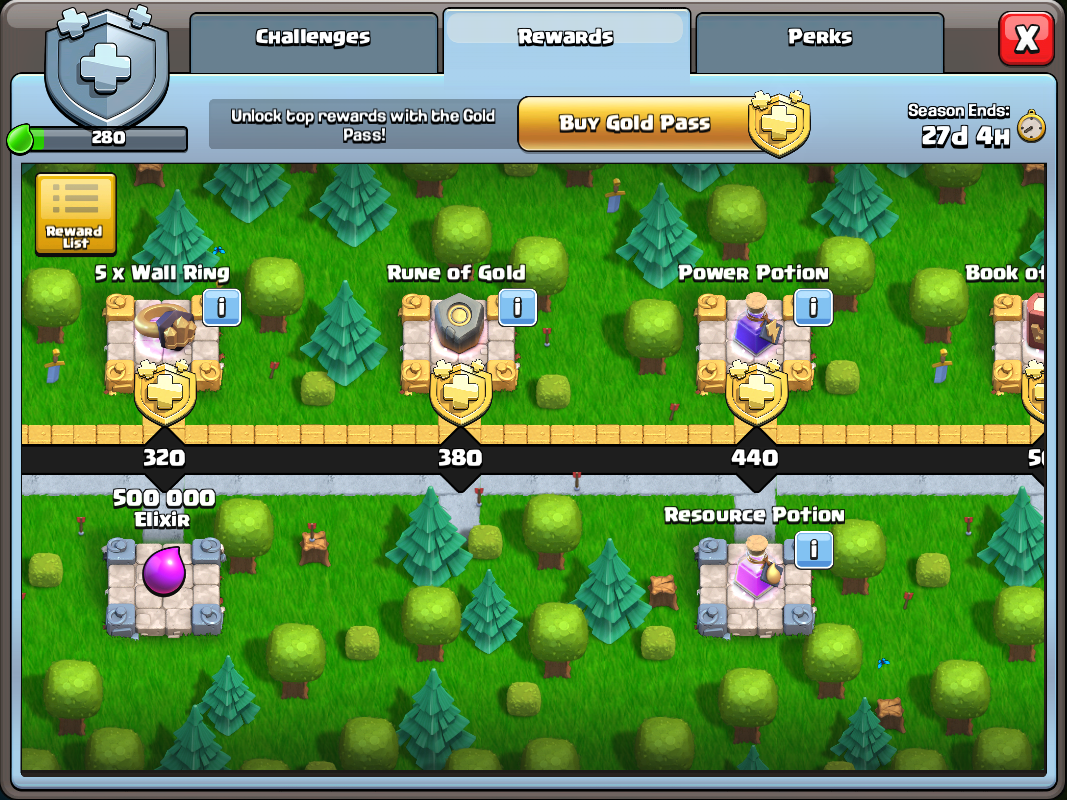 이처럼 업데이트는 미미하나, 대놓고 유료 게임을 하나 만들어냈다. 클랜 게임, 리그전과 유사한 것이나 혼자 하는 것이다. 대신 골드패스를 구입하면 상단에 보이는 아이템들(금색으로 칠해진 선 위에 있는 것)을 선물로 주고, 무료 게임을 하는 사람들은 하단에 보이는 것만 준다. 골드패스 가격은 4.99달러다. 이 게임은 한 달간 지속되므로, 한 달에 한 번씩 4.99달러를 삥 뜯겠다는 것으로 보인다.