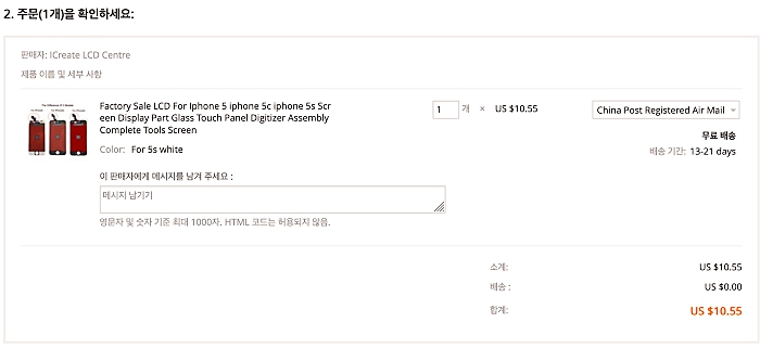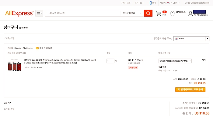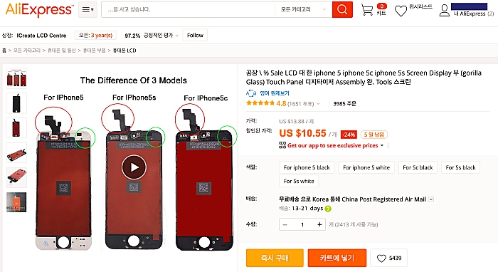 이베이, 알리익스프레스를 검색하니 아이폰 깨진 액정 교체용 디스플레이를 10달러~13달러 (1만원~13,000원 정도)에 팔고 있었다. 몇 곳 보다가 상품평이 좋으며 최저가로 파는 곳에서 주문했다. 알리익스프레스는 해외직구이나 한글화가 꽤 잘 되어 있어 주문이 어렵지 않다.