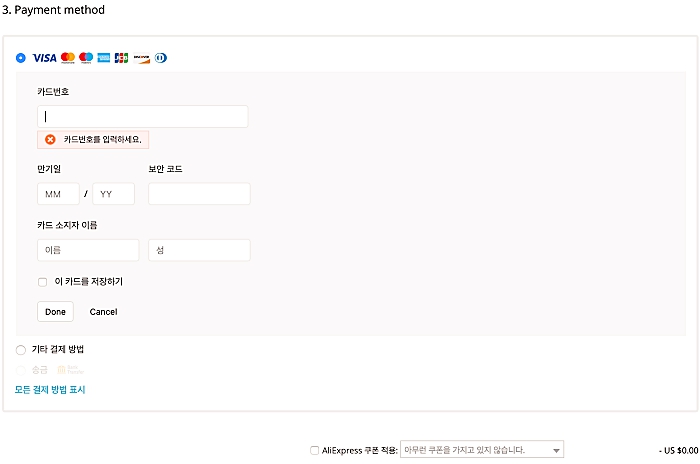 지불 방법을 입력한다. 필자의 경우 해외직구할 때는 잔액 적은 체크카드를 이용한다. 혹시 카드 번호 유출, 도용이 되더라도 안전하도록. 하단에 알리익스프레스 쿠폰 적용이 있었는데, 쿠폰이 없었다. 검색해서 몇 개 넣어봤는데 만기 된 것이라 그냥 결제했다.